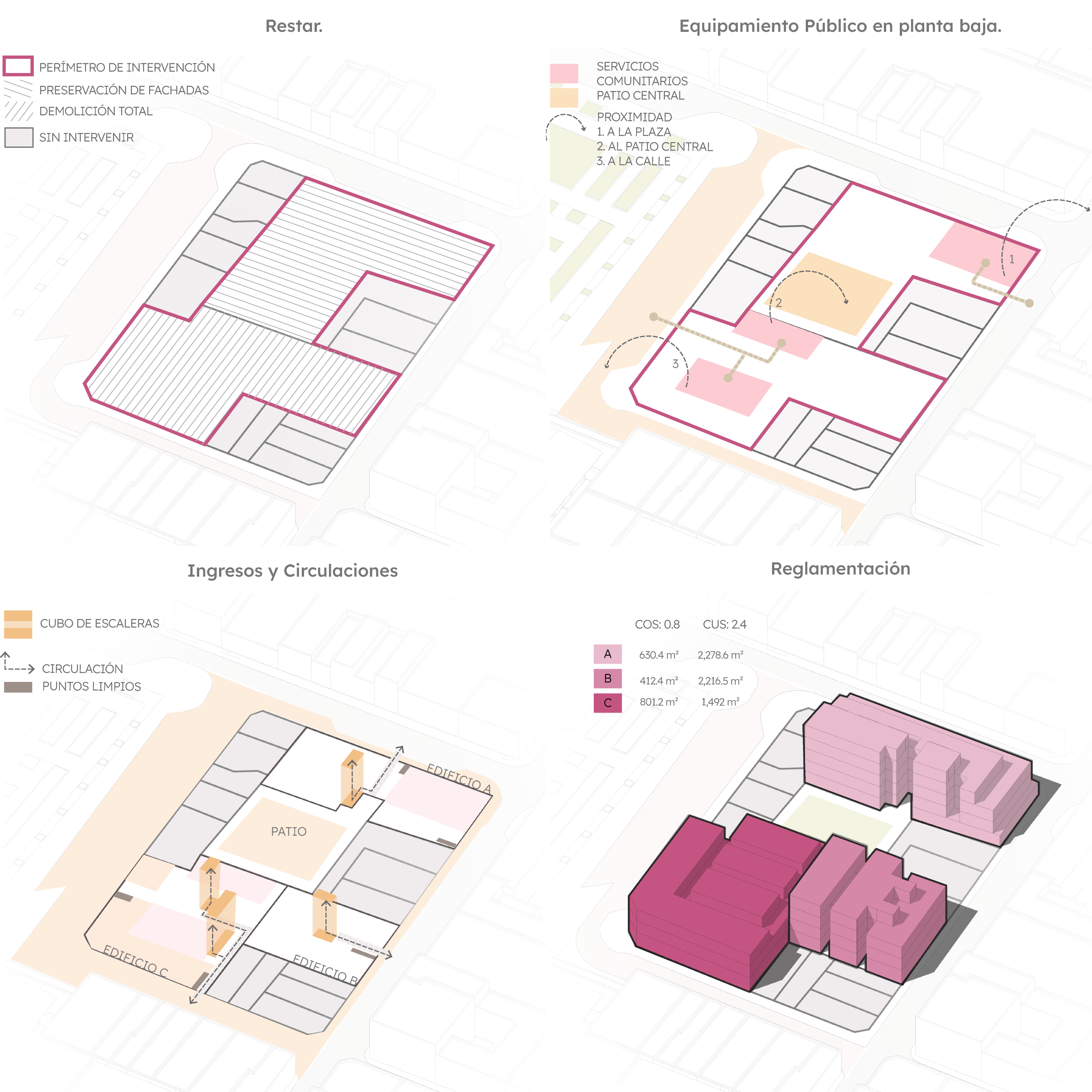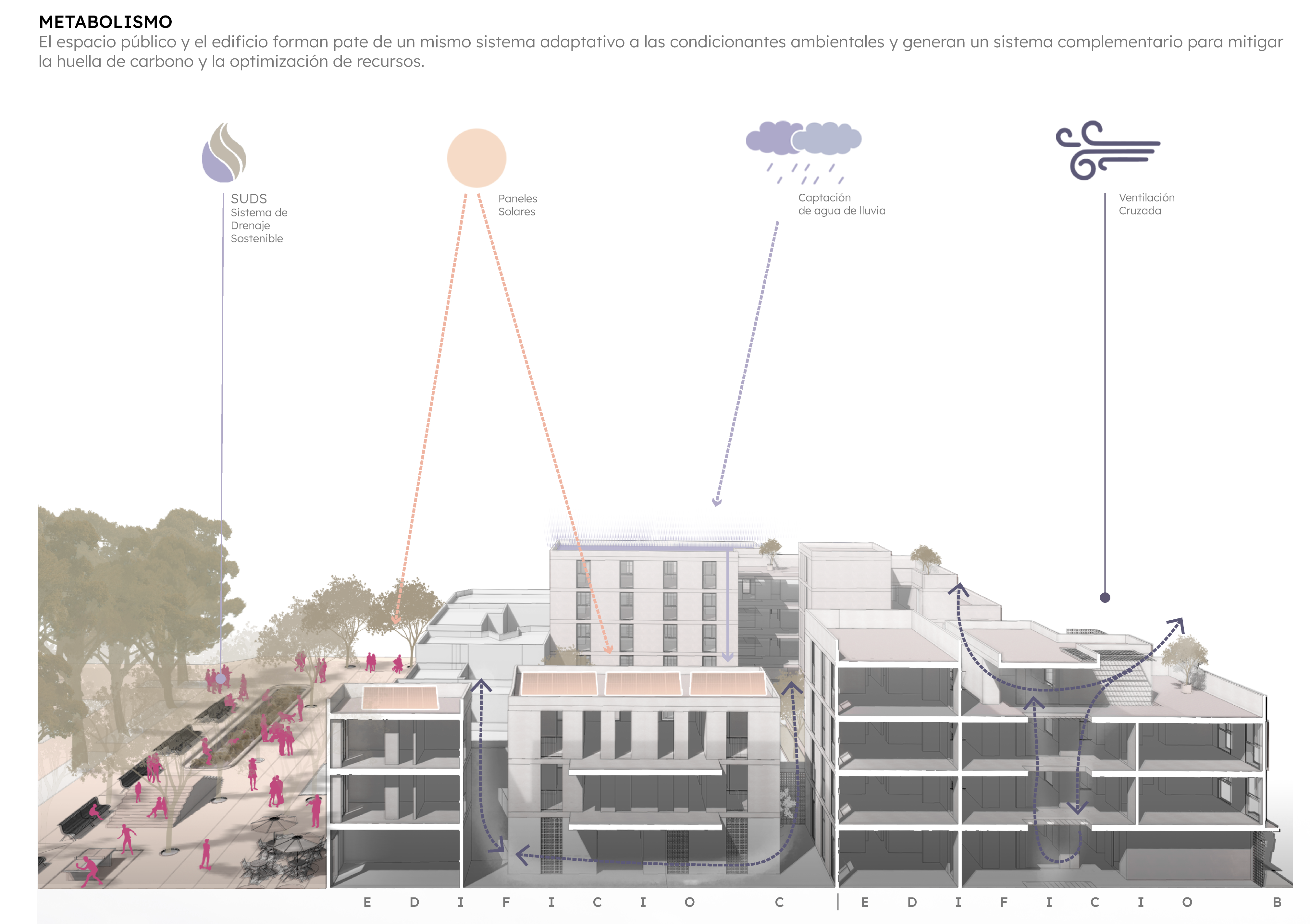 Frente a esta problemática, se plantea una propuesta integral que aborda la habitabilidad no sólo desde la resolución del problema arquitectónico, sino como un conjunto de elementos que consideran el contexto urbano, social y económico en el que vivimos actualmente.