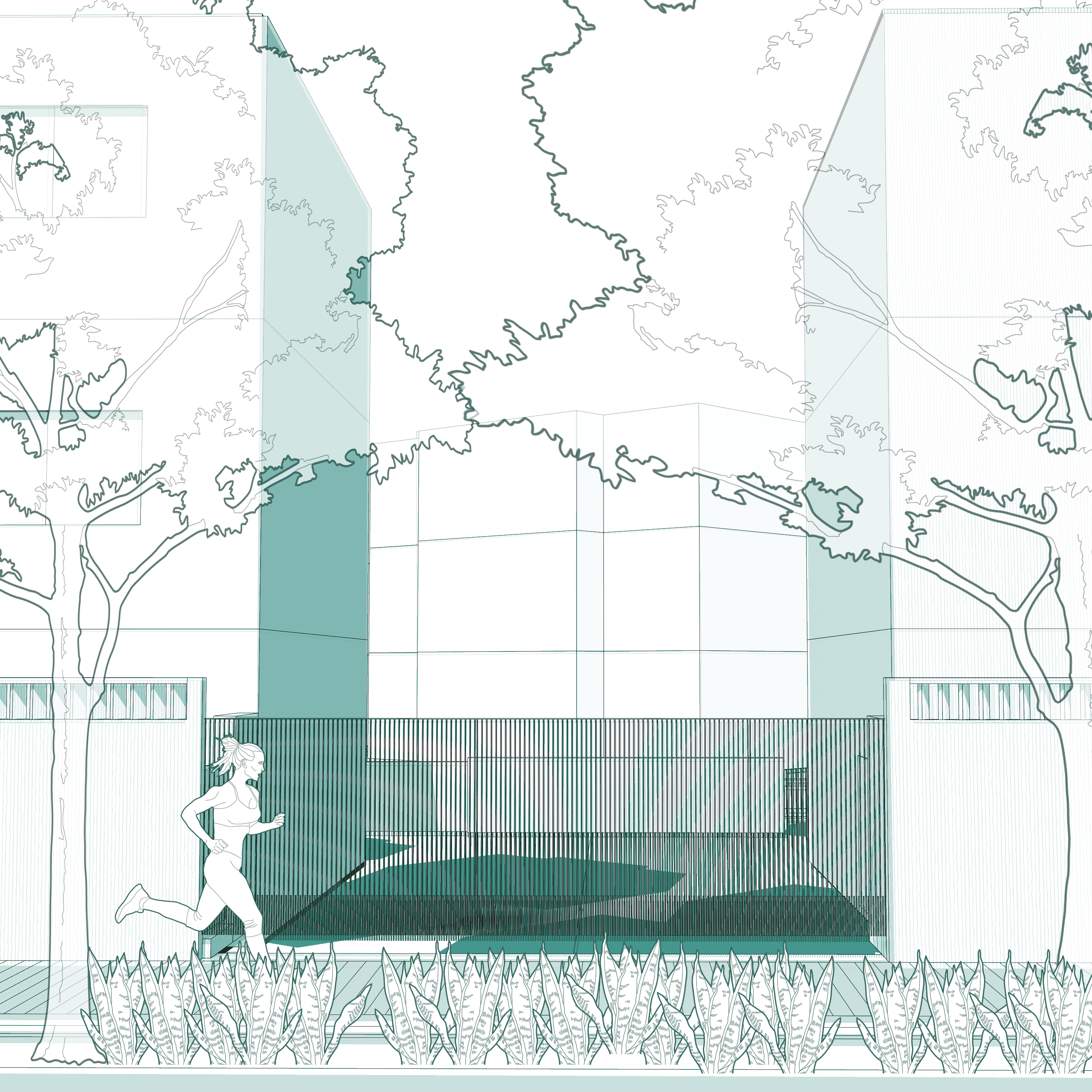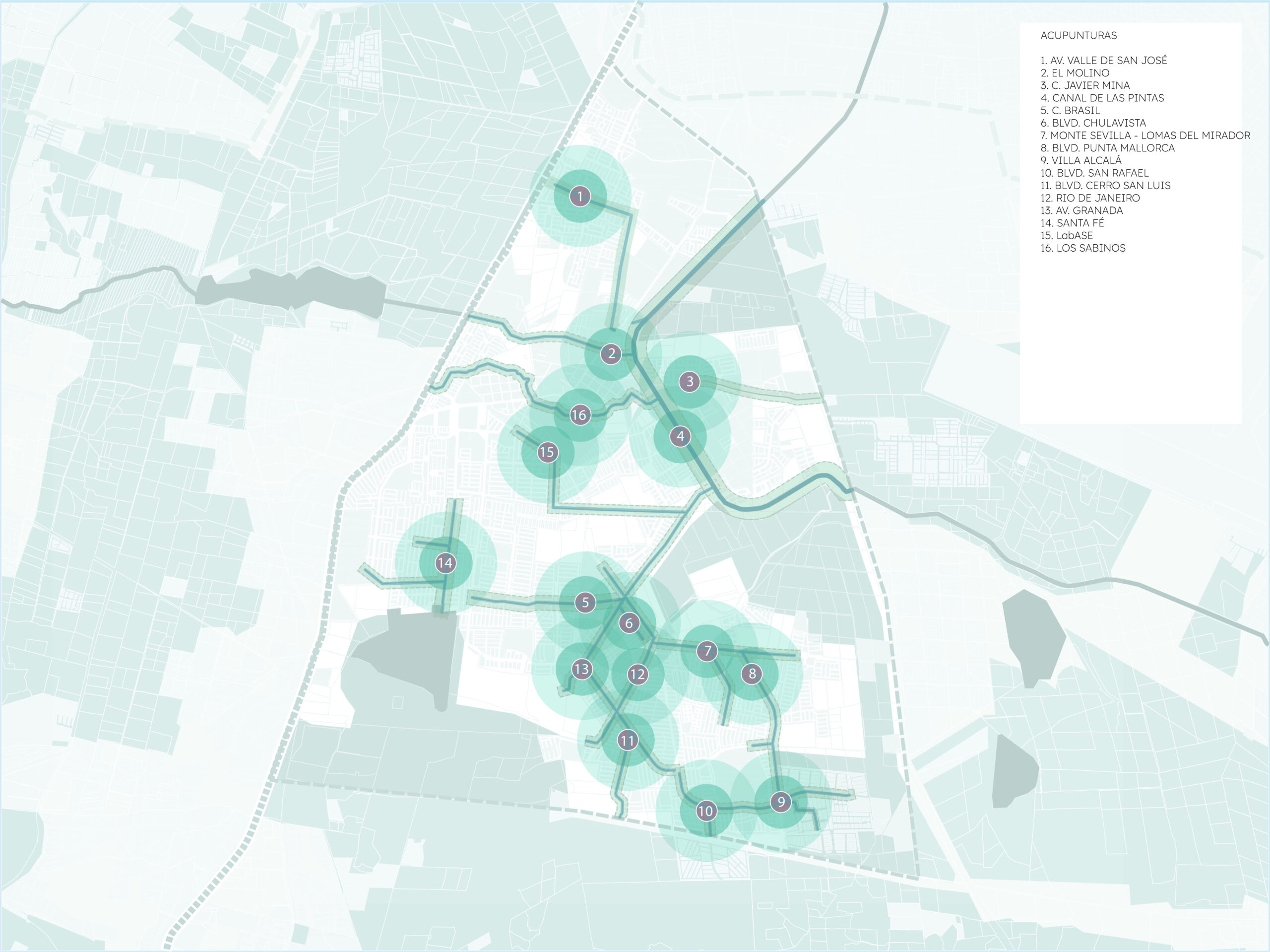El proyecto aborda el tratamiento de los canales en relación al espacio público con el objetivo de mejorar las condiciones de habitabilidad del Distrito Santa Fe en Tlajomulco.